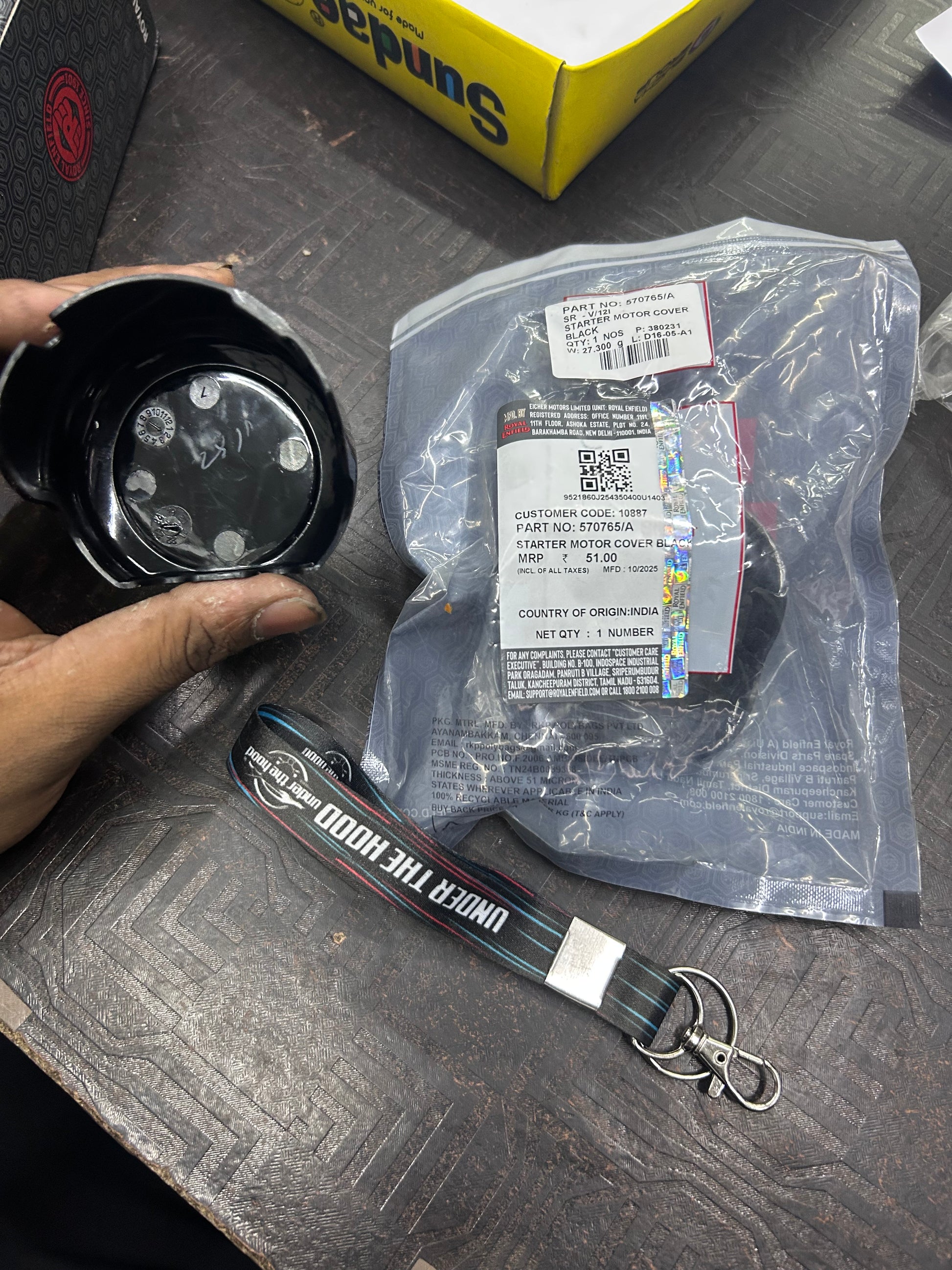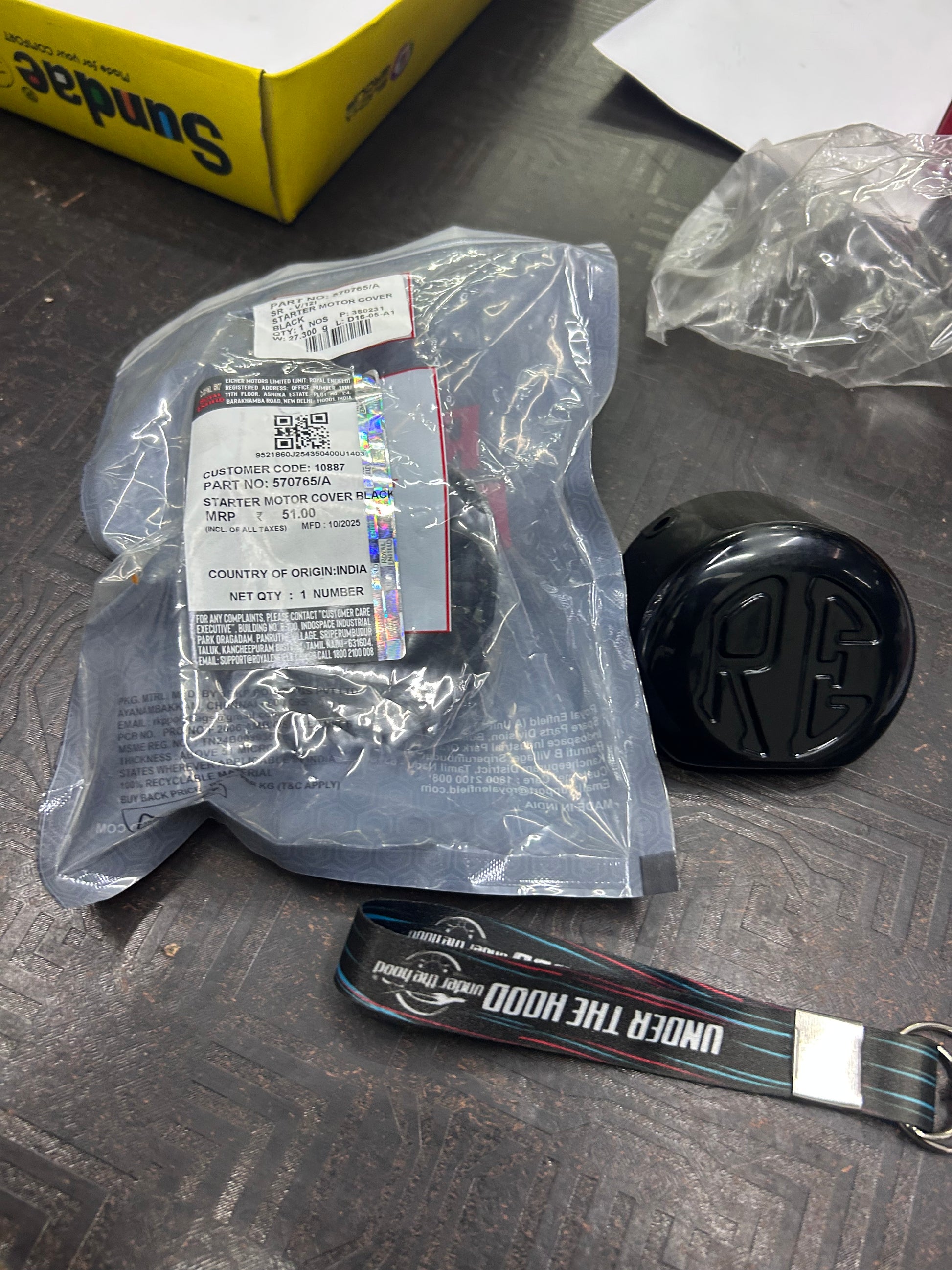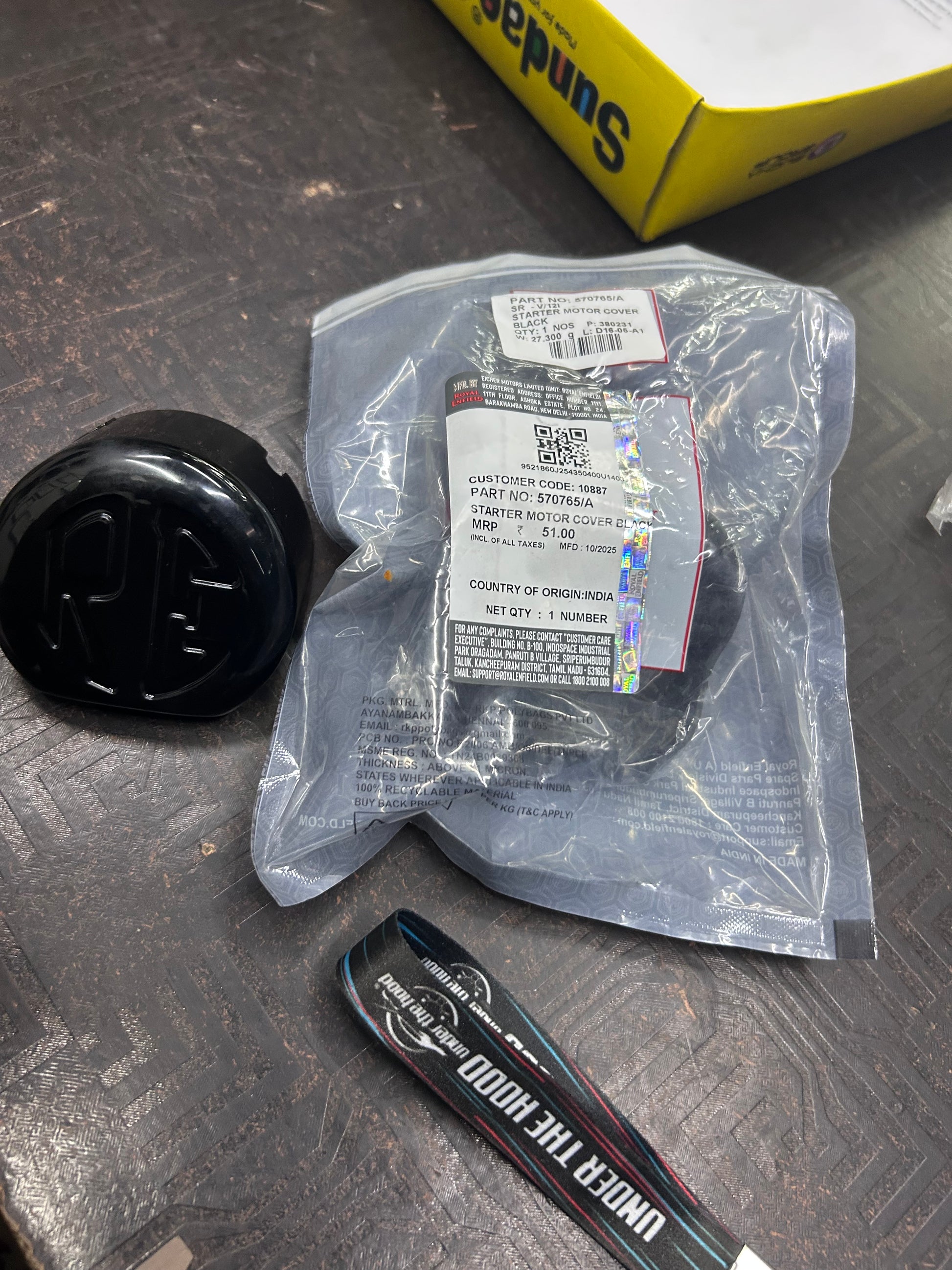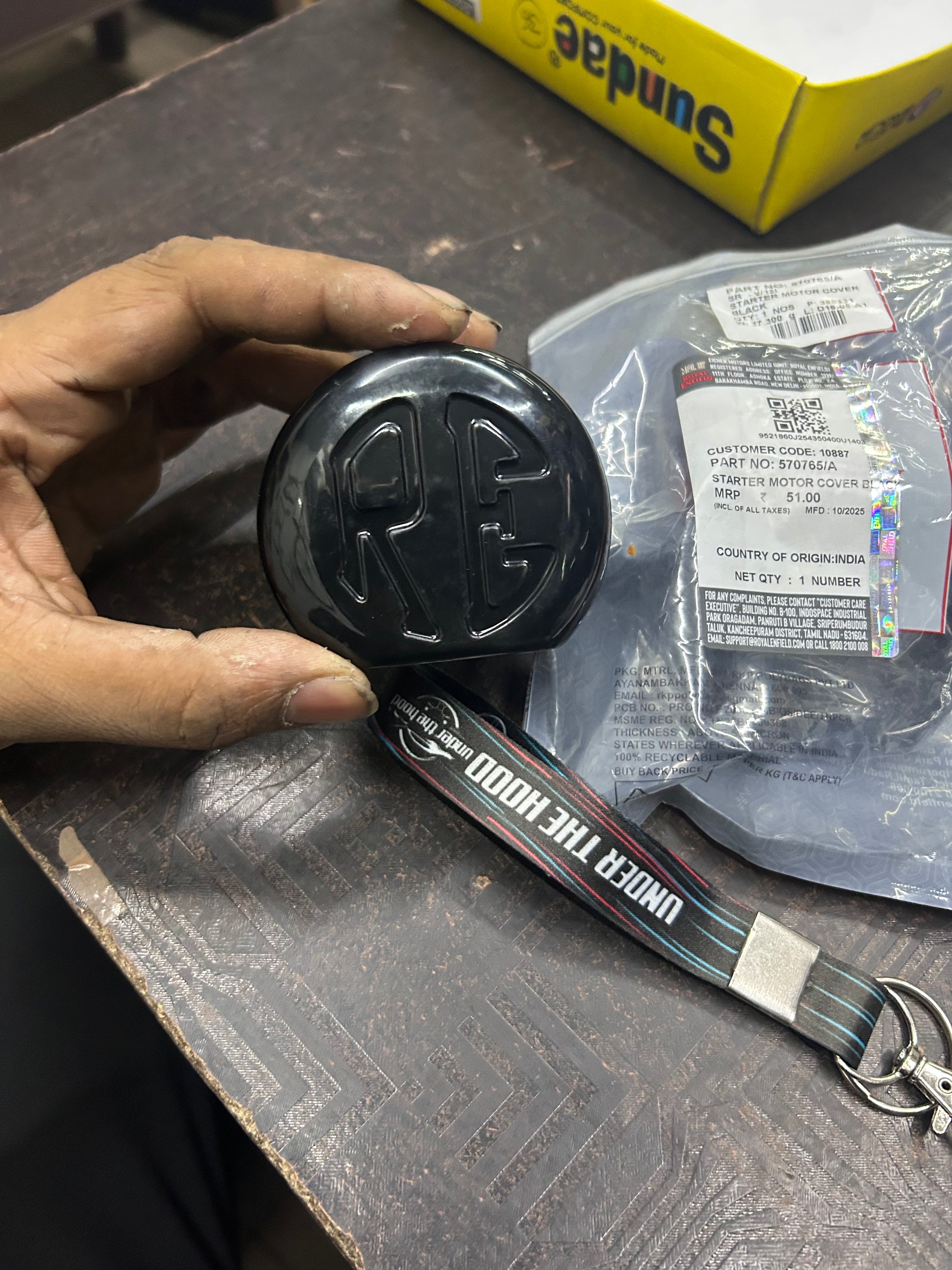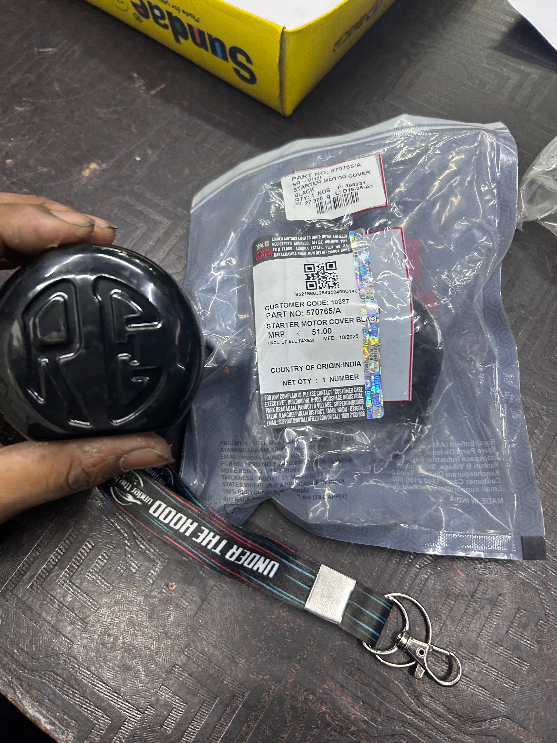 Genuine OE Royal Enfield part – 570765/A (starter motor cover, black).