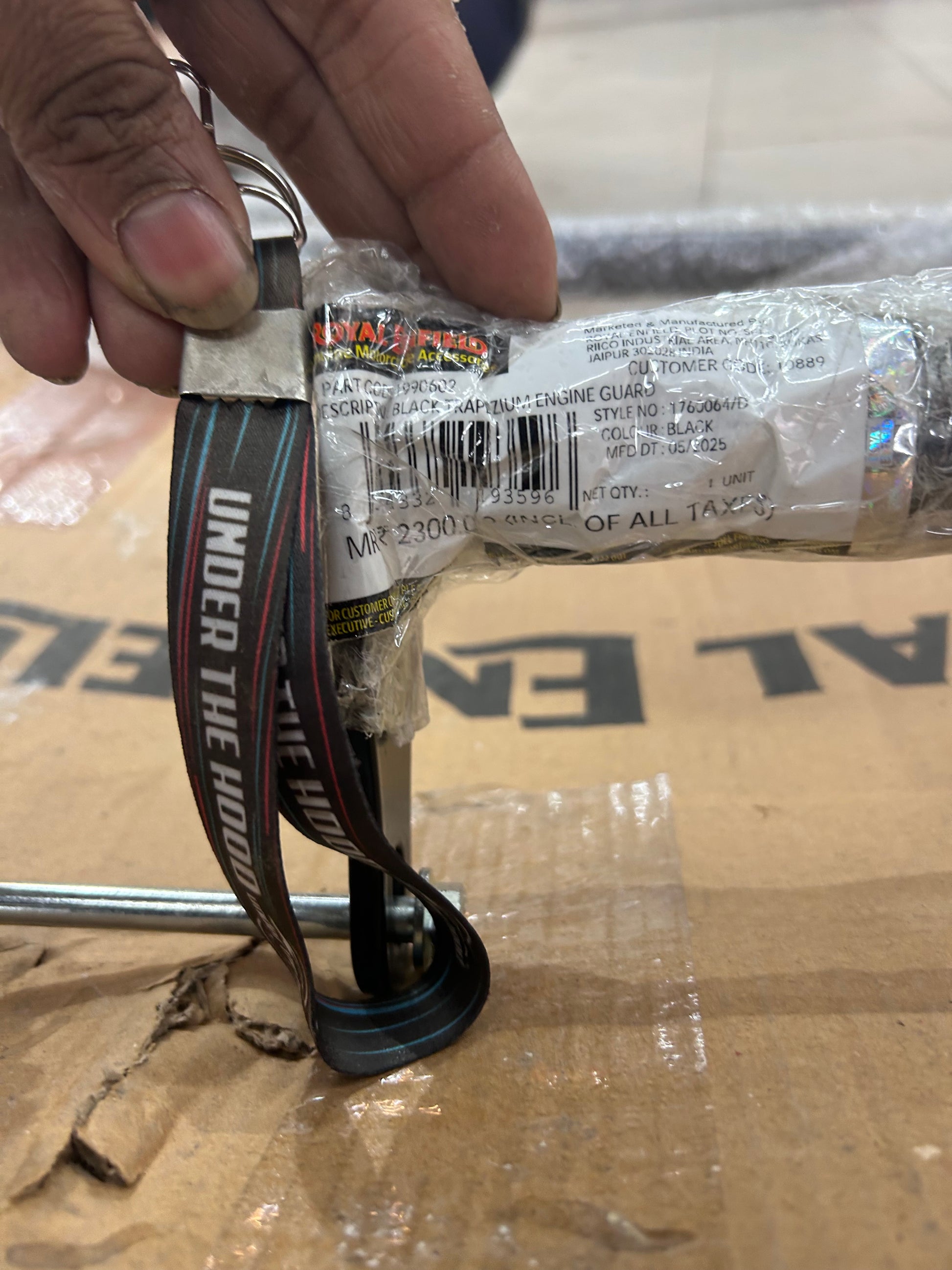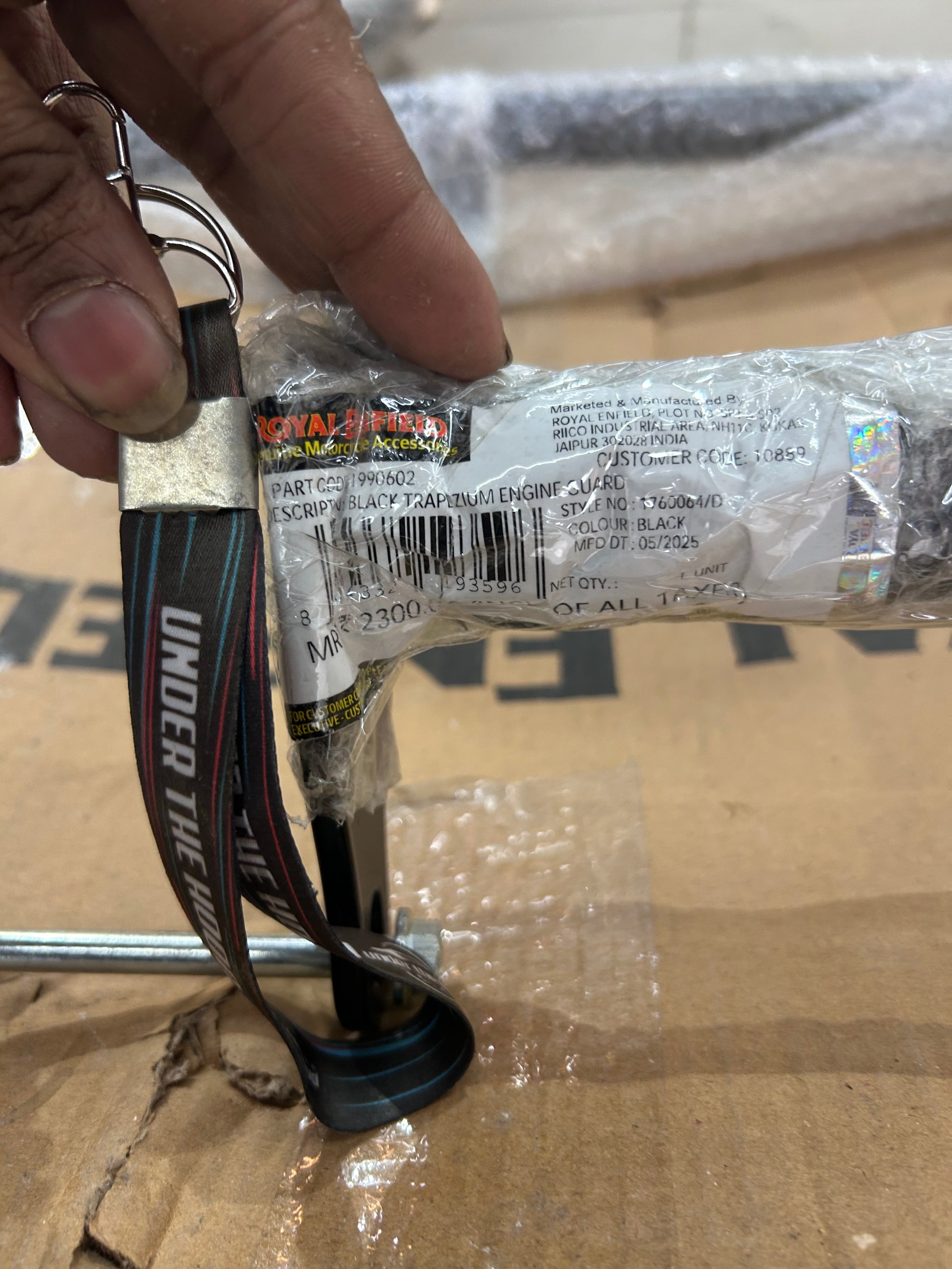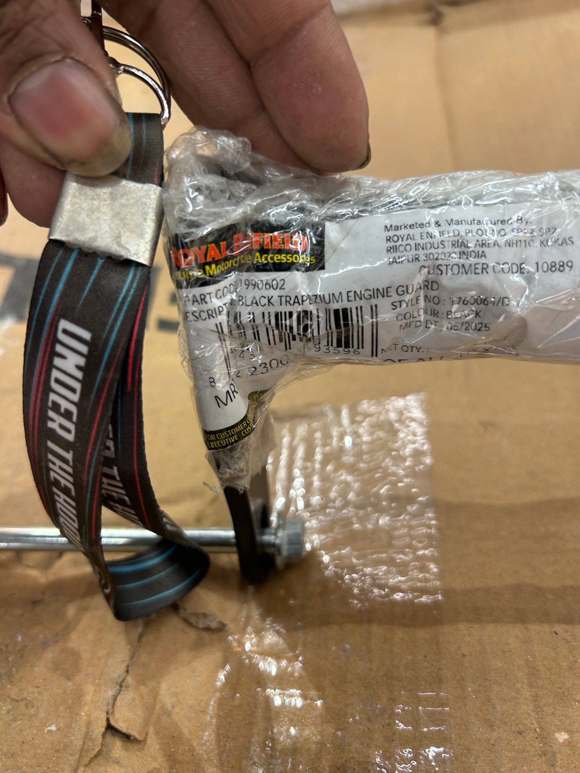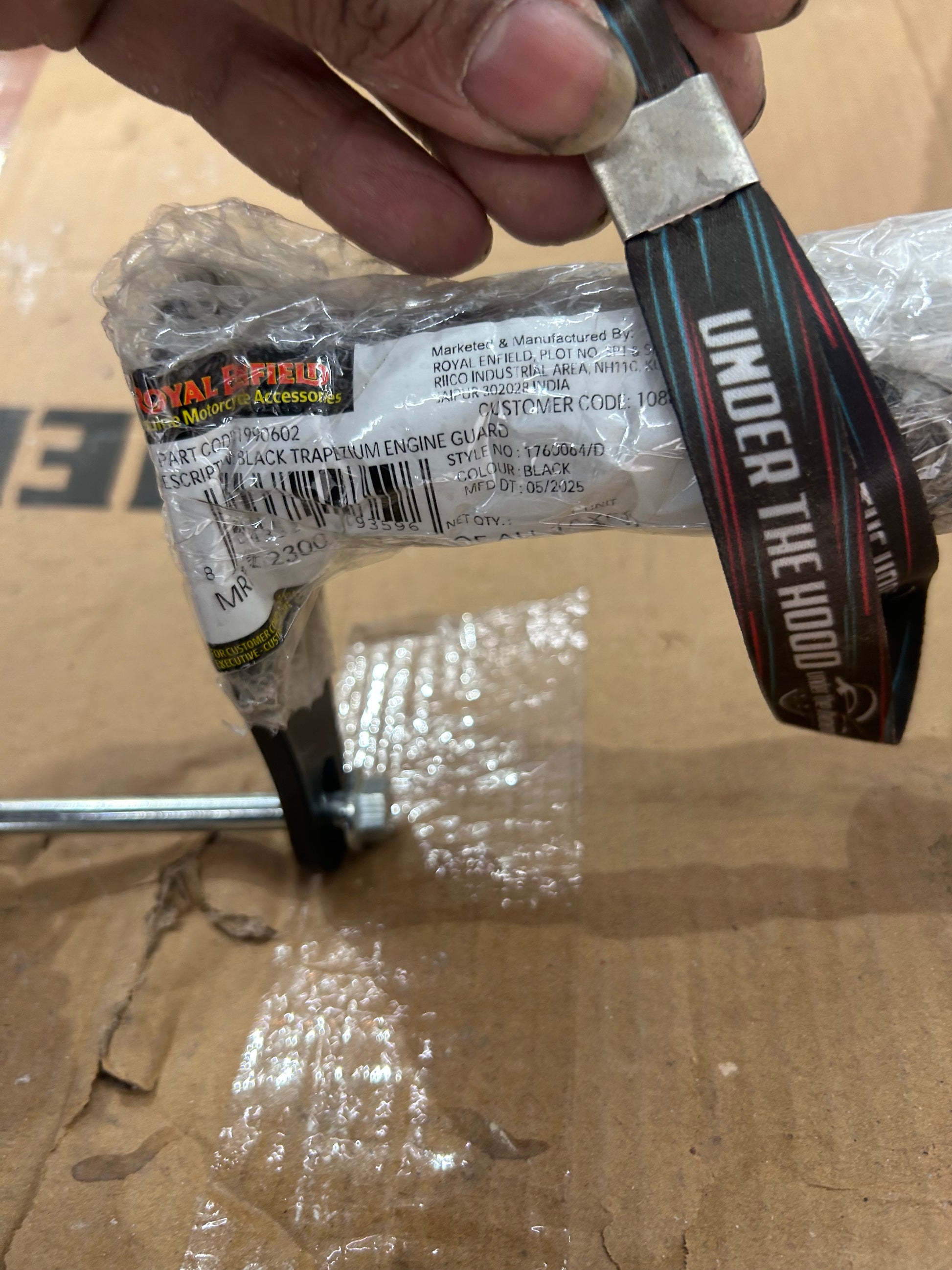 Royal Enfield’s own accessory documentation and fitment pages identify 1990602 as the Black Trapezium Engine Guard, with a typical ≈20-minute fitting time. The kit uses stock mounting points for a true bolt-on install—no drilling or welding. A polished stainless version exists, but that’s a different part number (1990635); this listing is specifically for black.
