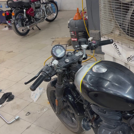 Give your Royal Enfield a true Continental GT cockpit. This conversion kit swaps your stock handle setup to GT-style clip-ons for a lower, more aggressive riding posture with direct steering feedback. Each kit is OEM-grade and includes matched clip-on bars, mounting collars, bar end weights, rubber isolation parts and the small hardware that makes the swap clean and repeatable.