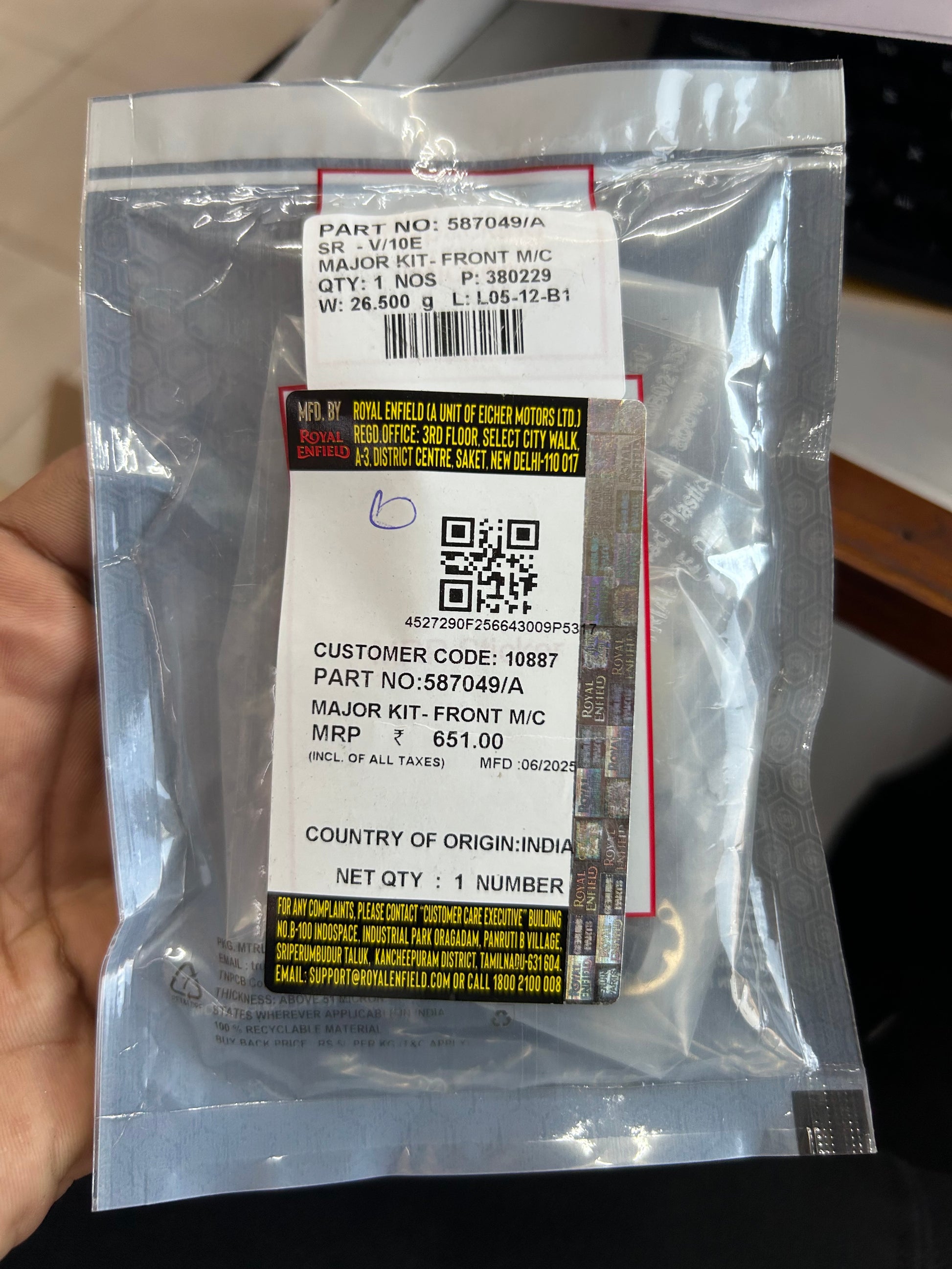 Restore crisp and reliable braking performance with this genuine Royal Enfield Front Master Cylinder Major Kit (Part No. 587049/A). Designed as a factory-approved rebuild kit, it includes the piston, return spring, primary & secondary seals, and dust boot for a complete hydraulic rebuild. This kit replaces worn components to eliminate spongy lever feel and optimize brake pressure. According to certified parts catalogs, this kit is OEM-fitted on Himalayan 411, Interceptor 650, and Continental GT 650 — confirmed by RE dealer listings