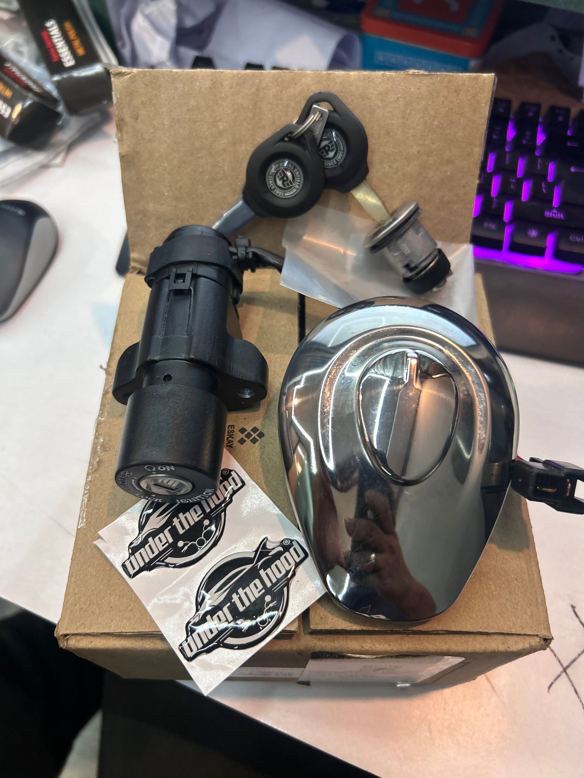 The kit typically includes ignition switch, fuel tank lock, and seat lock with matching keys (2 pcs). Always refer to the package details or images.