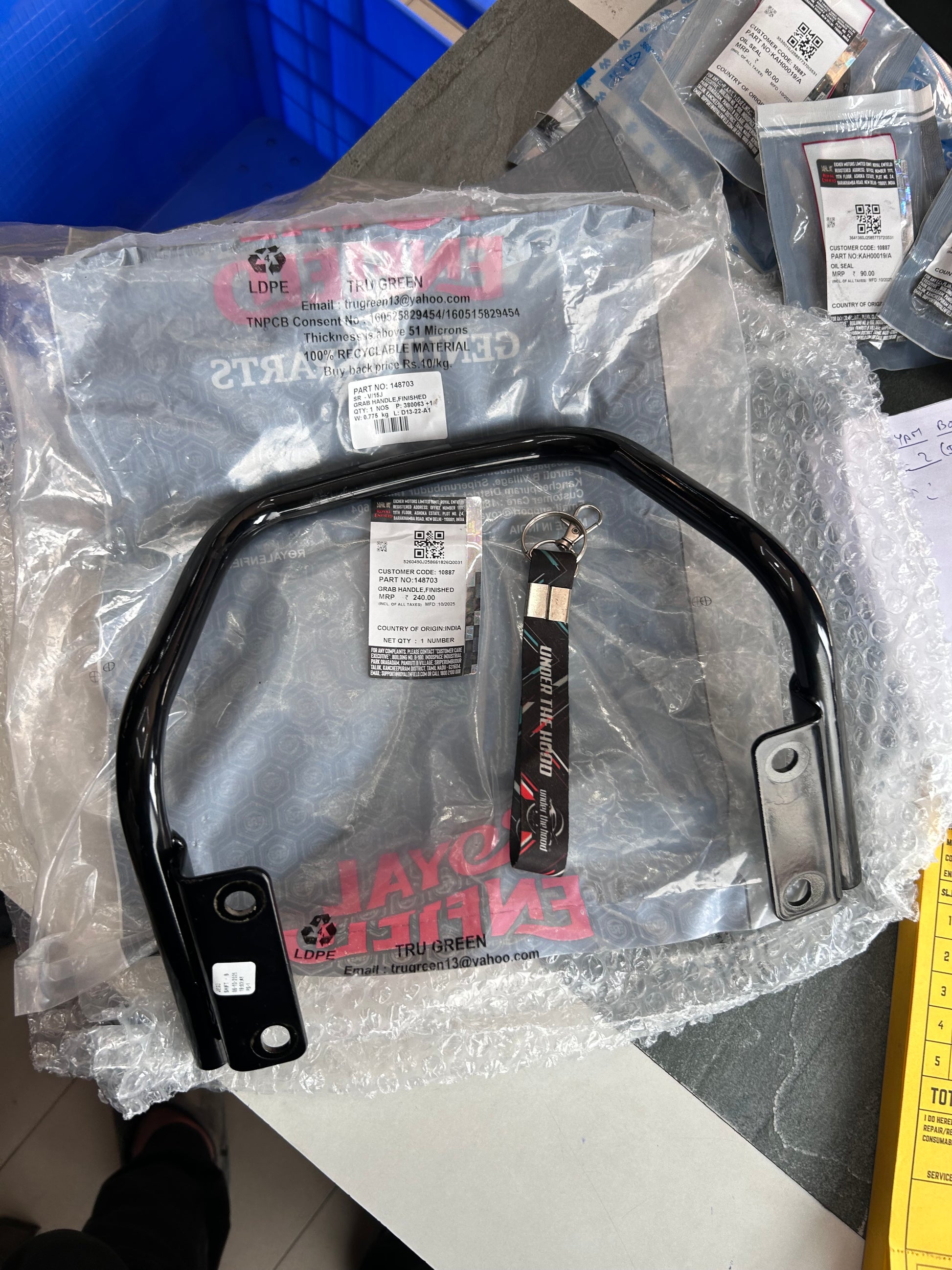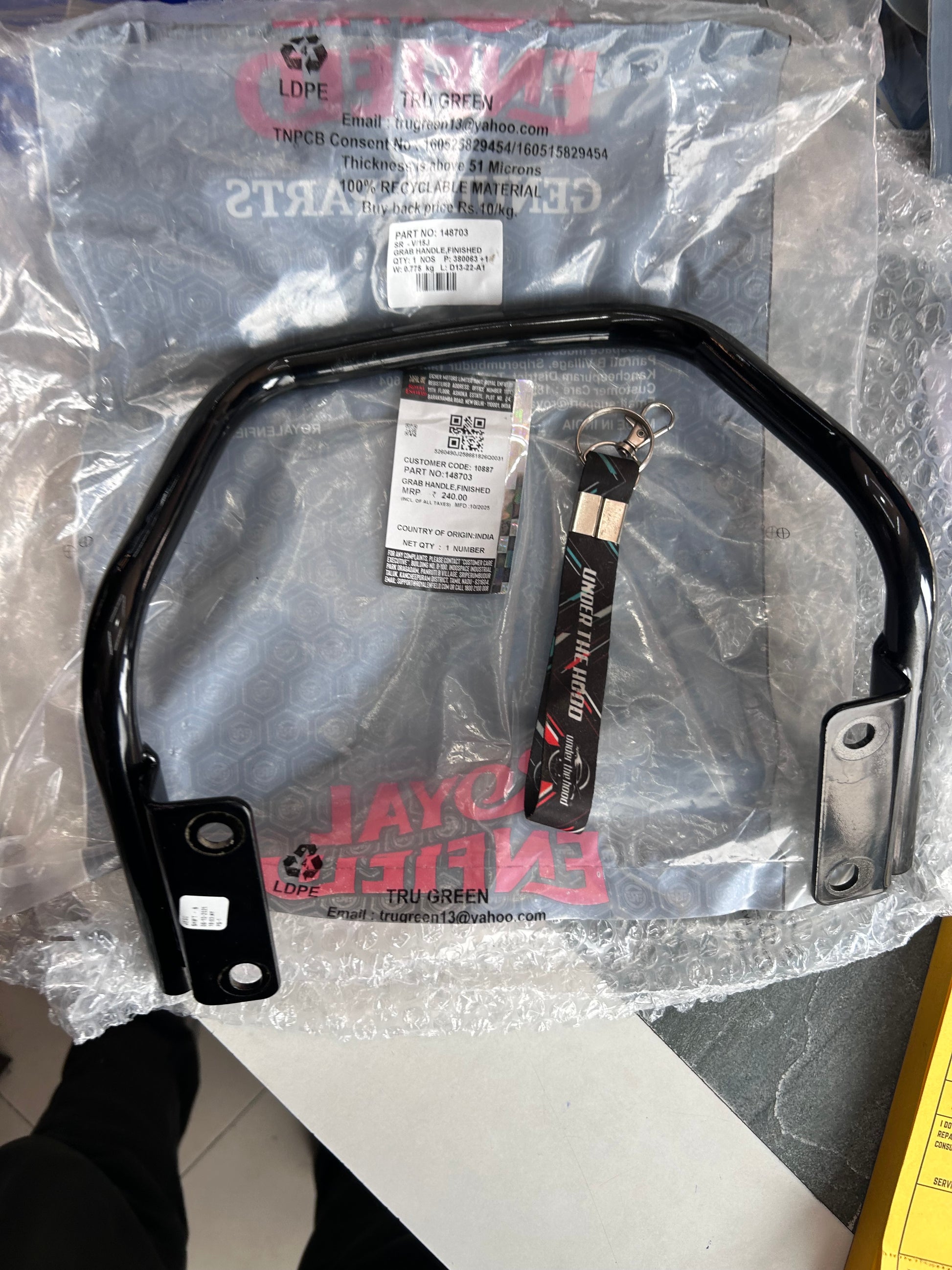 Upgrade comfort and enhance passenger safety with the Royal Enfield Passenger Grab Handle (Part 148703). This genuine OEM handle is identical to the one installed at the factory and offers a sturdy and polished grip for passengers on the Interceptor 650 and Continental GT 650.
