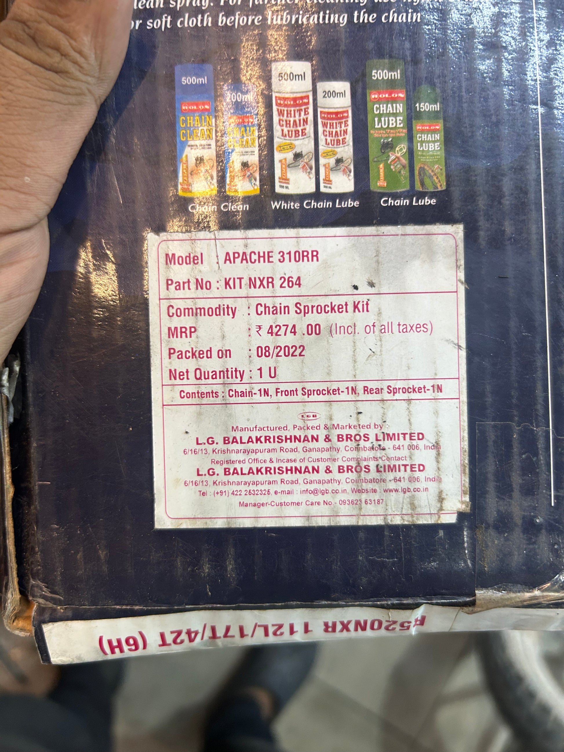 A. Yes. According to Rolon’s kit catalogue and multiple major retailers, NXR 264 is designed specifically for the Apache RR 310, with 17T/42T sprockets and a 112-link R520 sealed chain. It is suitable for all production years/BS stages of the RR 310 that retain the stock hub and gearing.