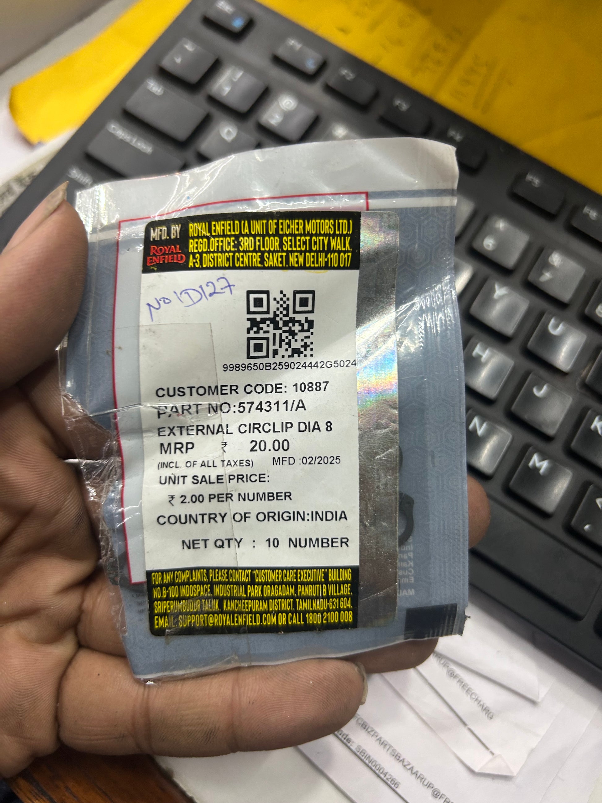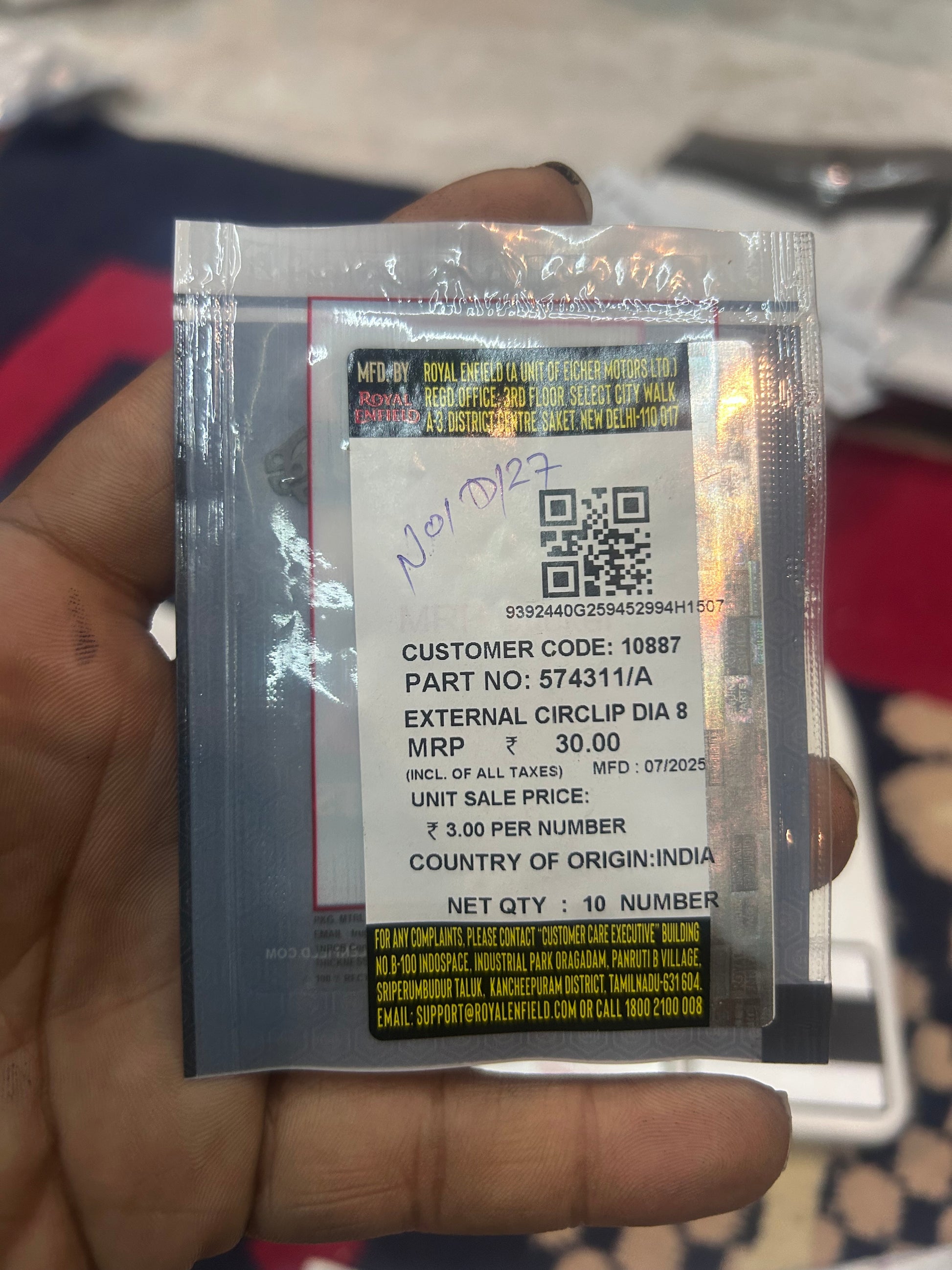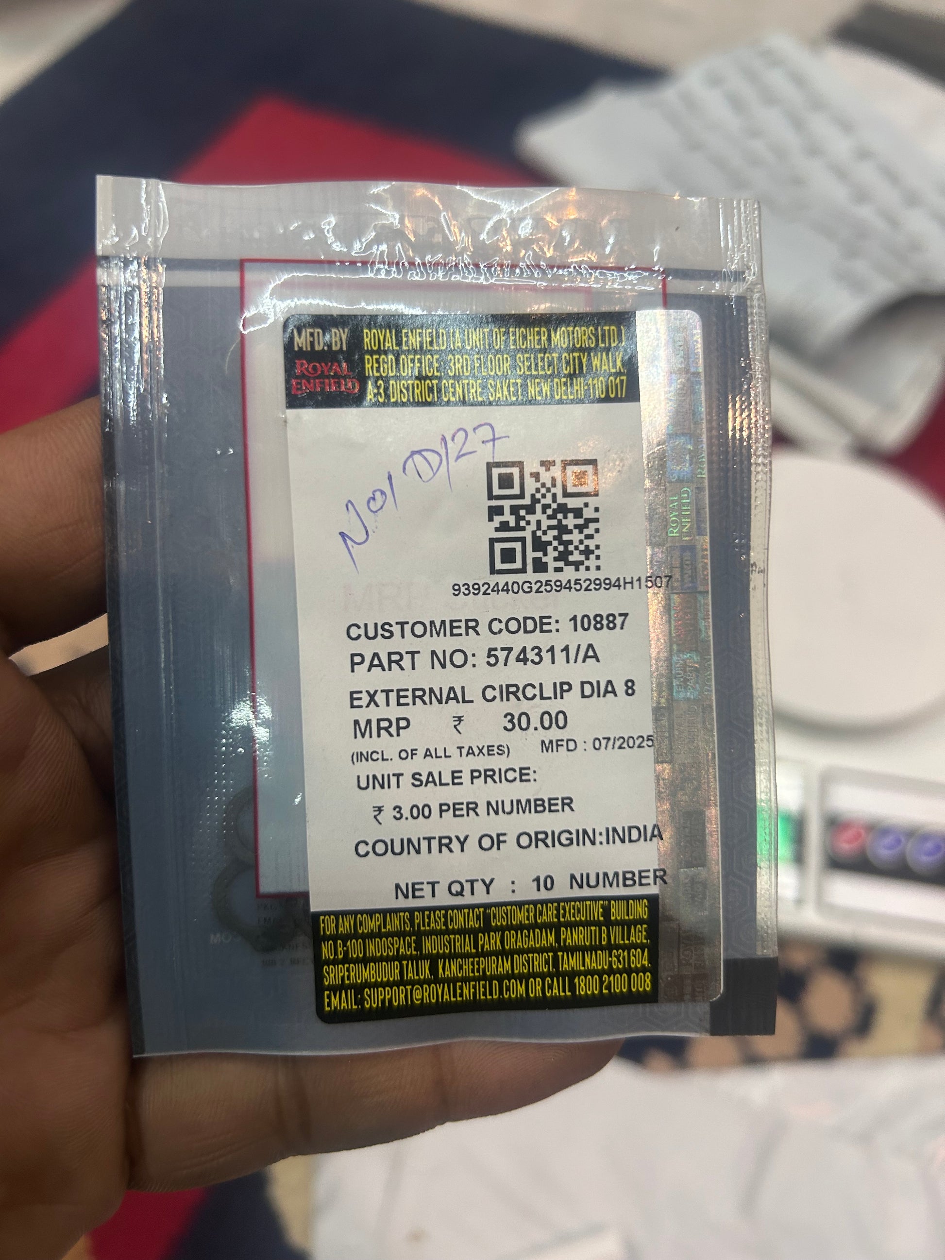 This is the original Royal Enfield External Circlip (Part No. 574311/A), used for securing the footrest pin in place on almost all Royal Enfield motorcycles except UCE engine models. Made from high-grade spring steel, this circlip ensures a firm and reliable lock for the footrest rod or pin, preventing accidental disengagement during rides. Essential for footrest assembly and long-term durability, this part is sold individually (single piece) and is a must-have for proper footrest maintenance or restoration jobs.