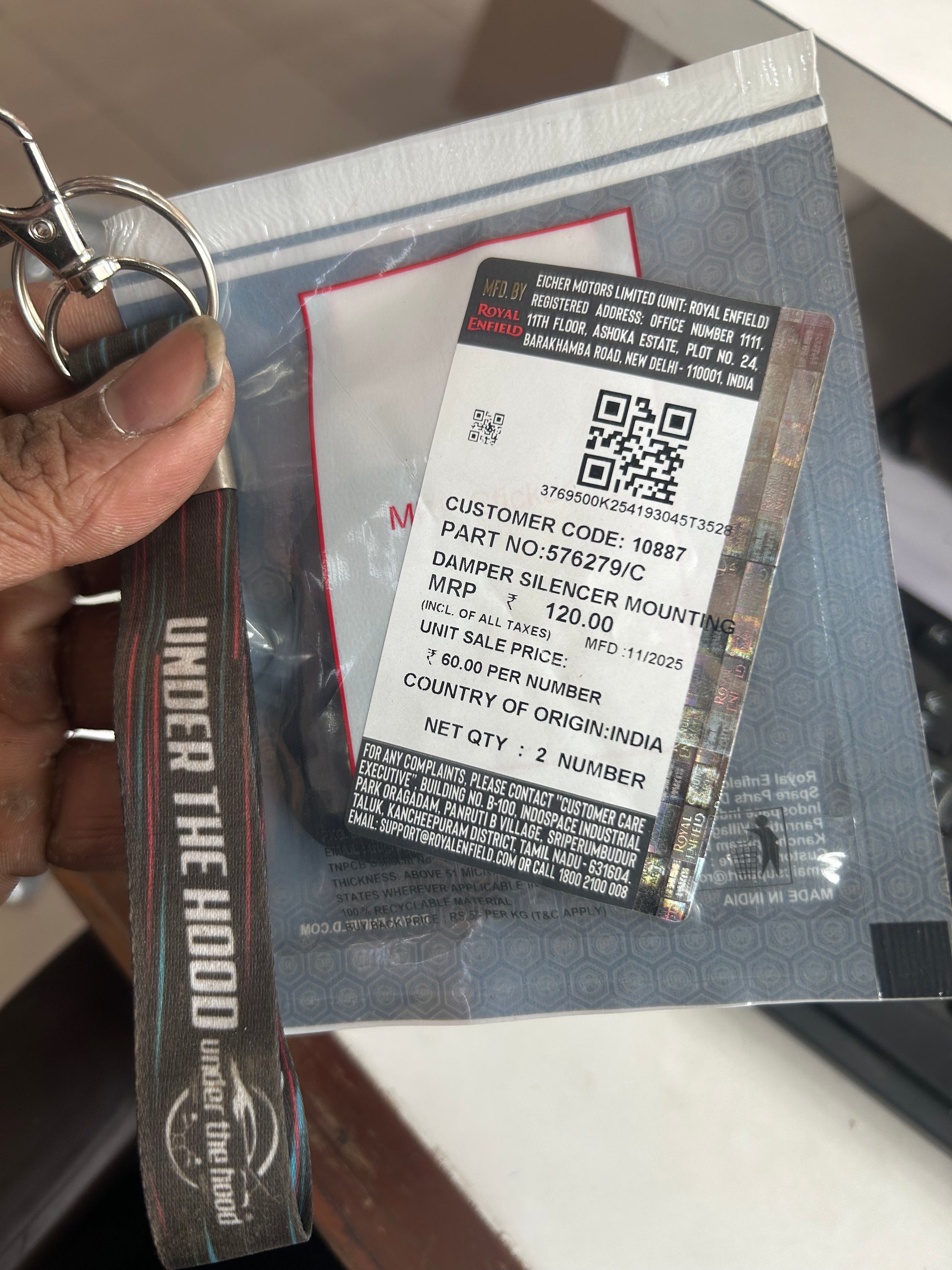 Indian price lists describe 576279/C – DAMPER SILENCER MOUNTING, HSN 40169960, which is the rubber-articles heading – again confirming it is a rubber exhaust damper, not a metal spacer. 576279 – DAMPER SILENCER MOUNTING with “Normal Qty Required: 4”, so a typical Interceptor/GT 650 uses four of these dampers across the silencer mounts.