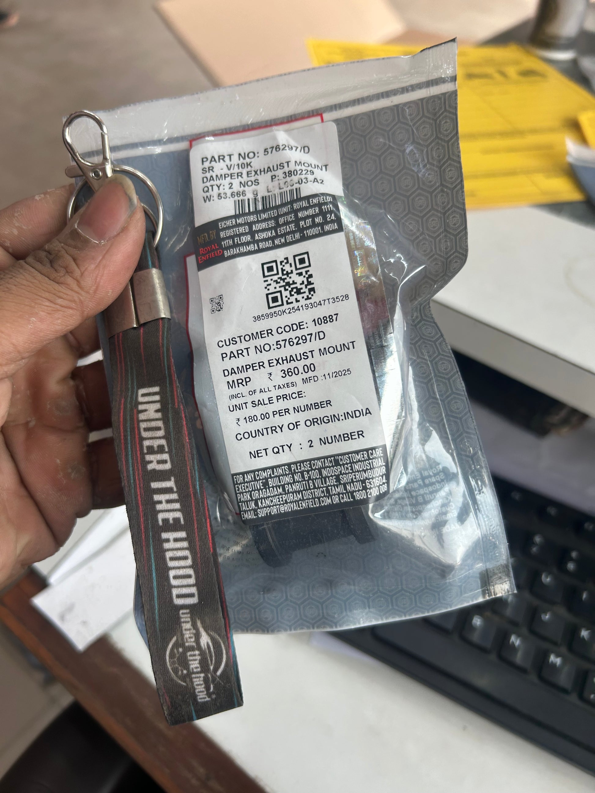 It’s a rubber component. Royal Enfield price lists classify 576297/D under HSN 40169960, which covers vulcanised rubber articles such as bushes and mounts, and export/import data clearly describes it as “DAMPER EXHAUST MOUNT” / exhaust rubber hanger.