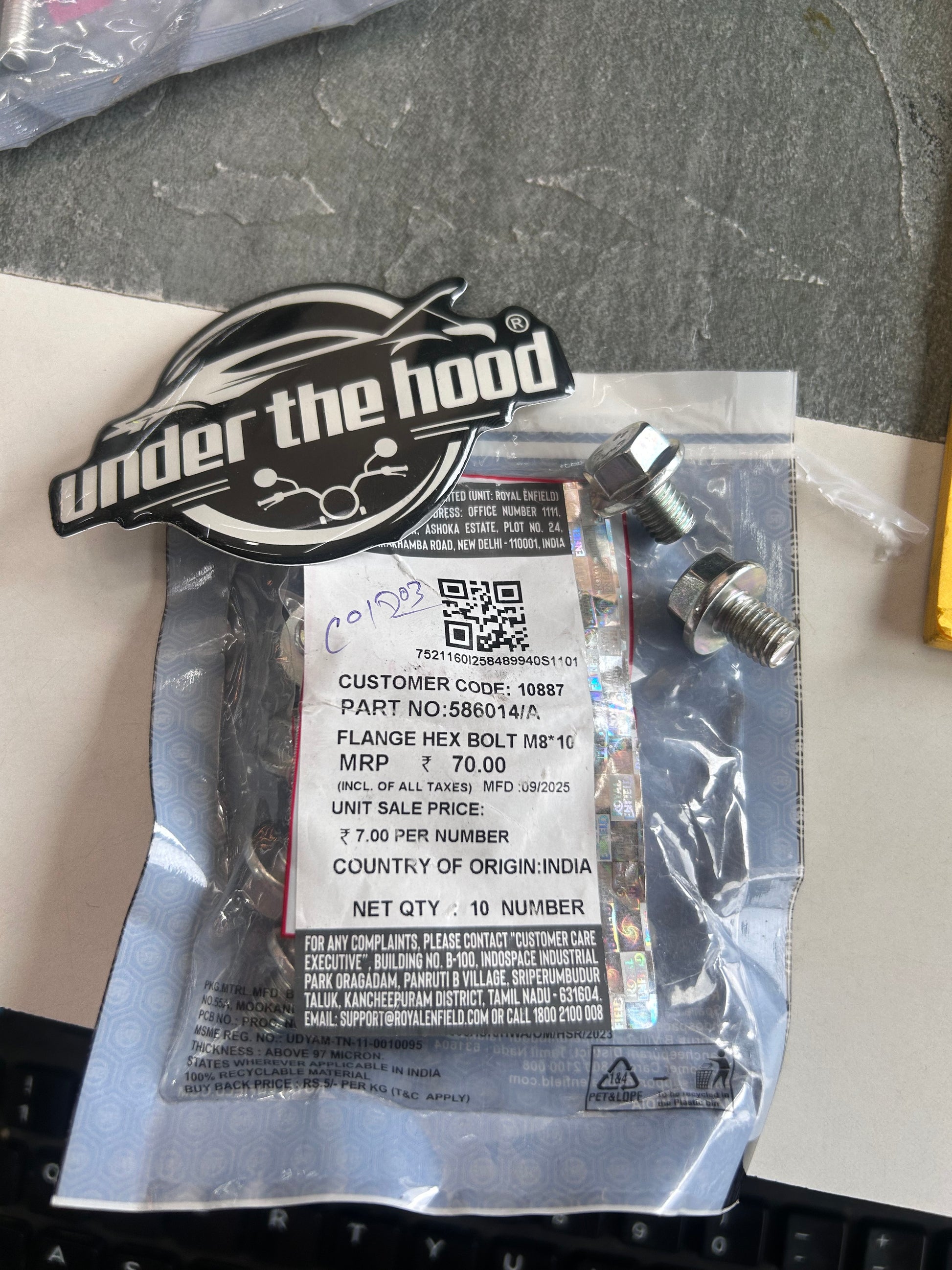 A single sealed pack from Royal Enfield contains 10 pieces. This listing is for one bolt — order 10 pieces for a full OEM pack.