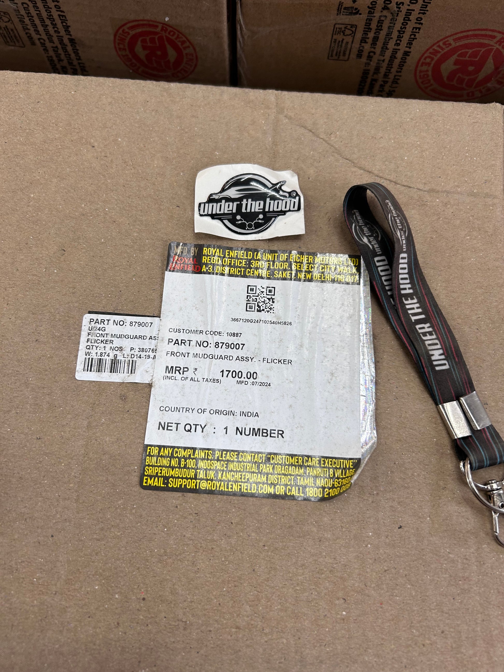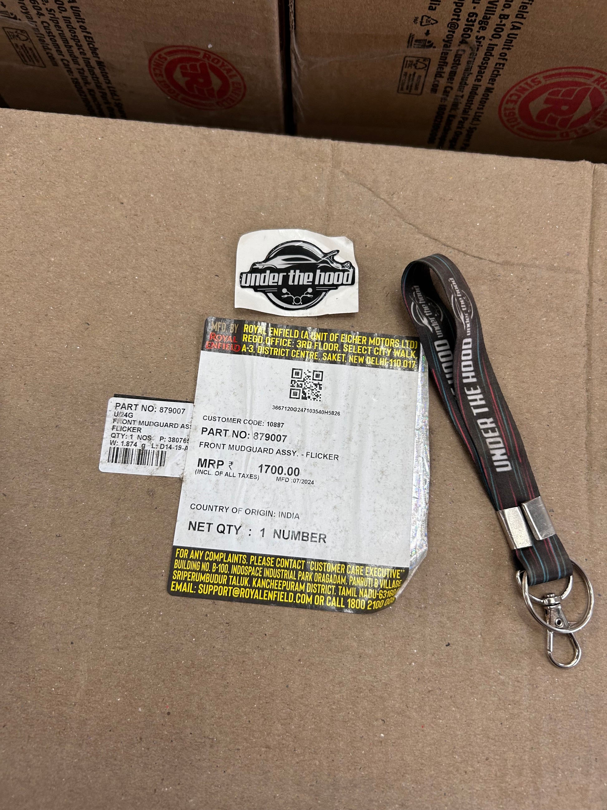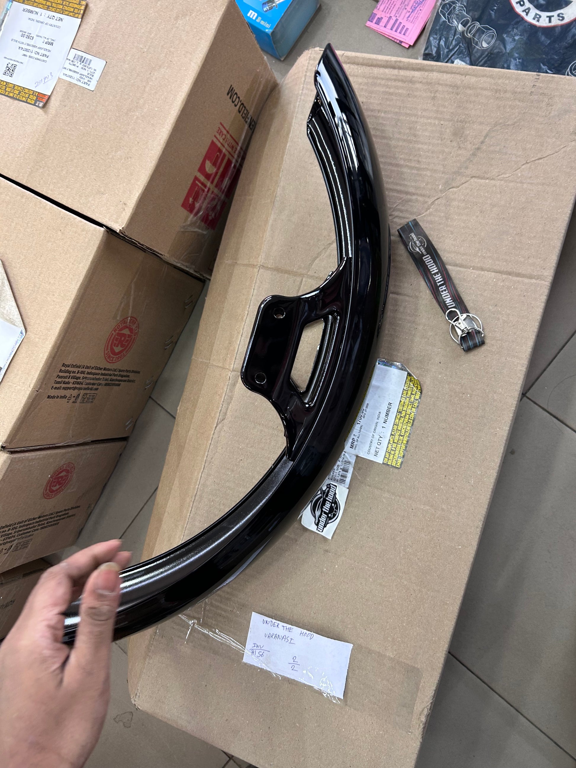 Genuine Royal Enfield front mudguard assembly – PN 879007.