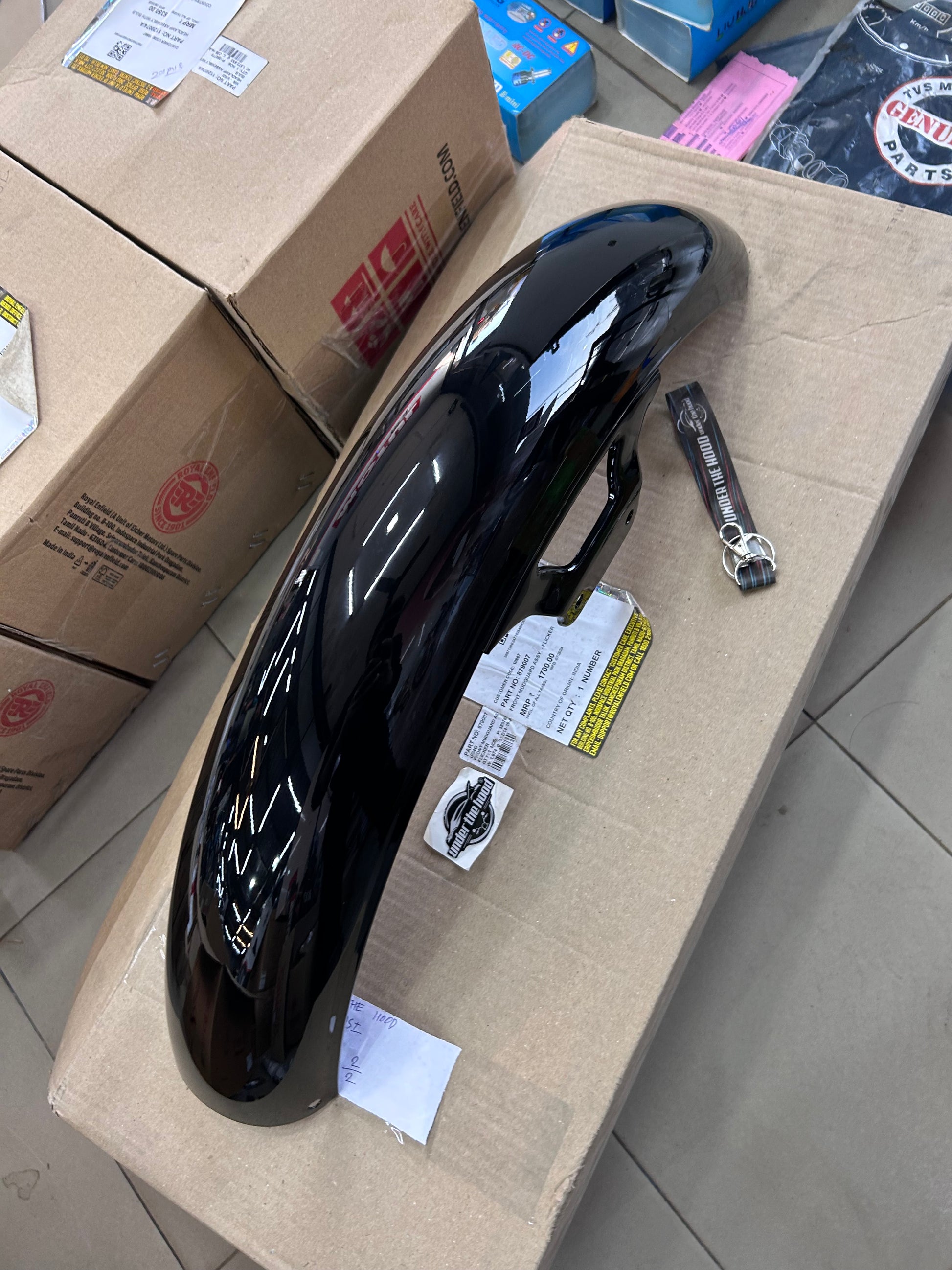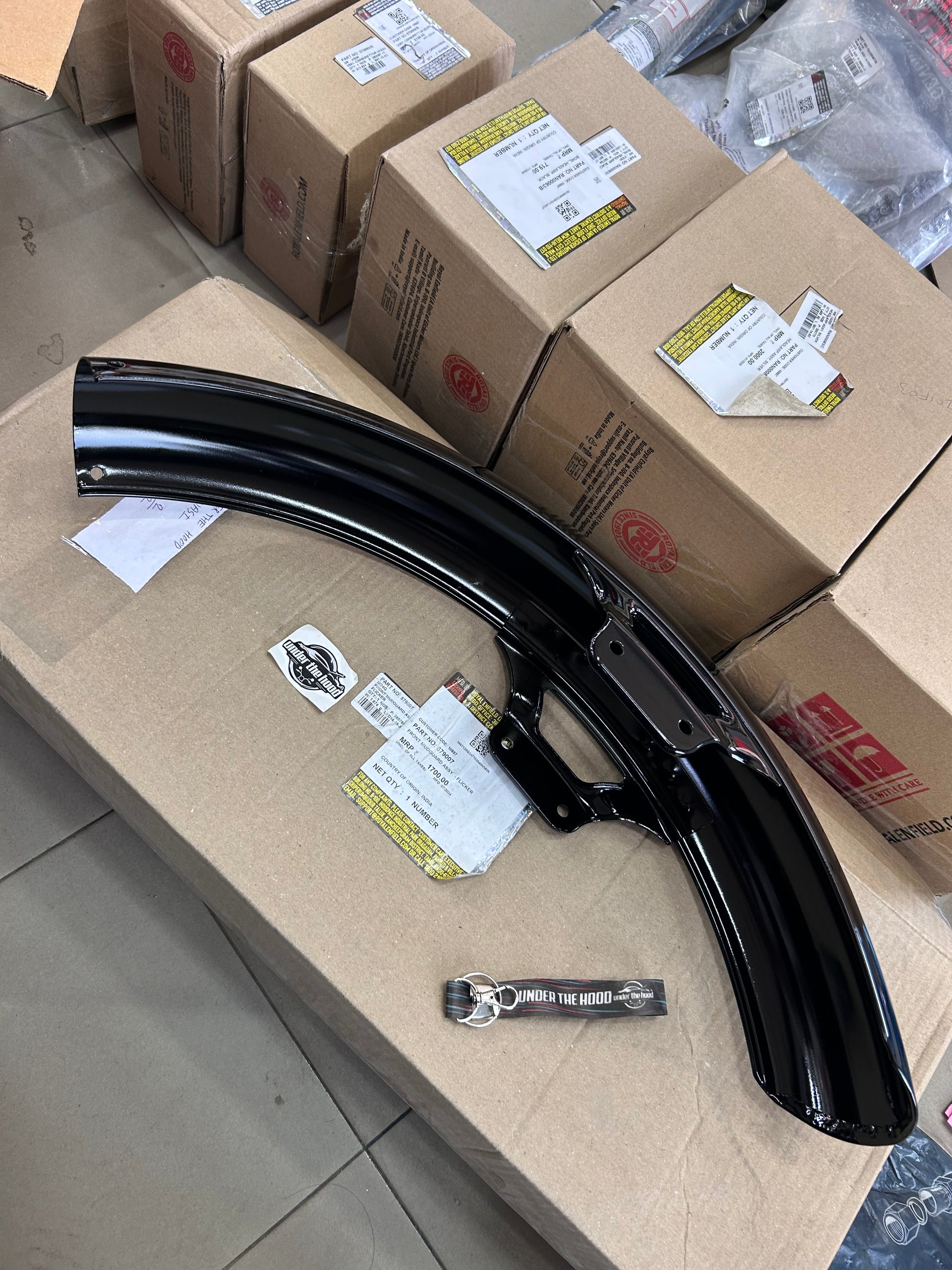 It’s a complete front mudguard assembly, pre-formed to the TB/TBX 19" front wheel and drilled for the TB lower-fork/mudguard stays, so it drops straight in — no redrilling or repainting. Use it when the original guard is dented, rusted, buckled from a fork hit, or you’re converting a repaired Thunderbird X back to the stock colour/texture. Because it’s OEM, the curvature, bead and mounting holes line up with the OE fork brace and you keep the factory look that matches the rest of the TBX blacked-out front.