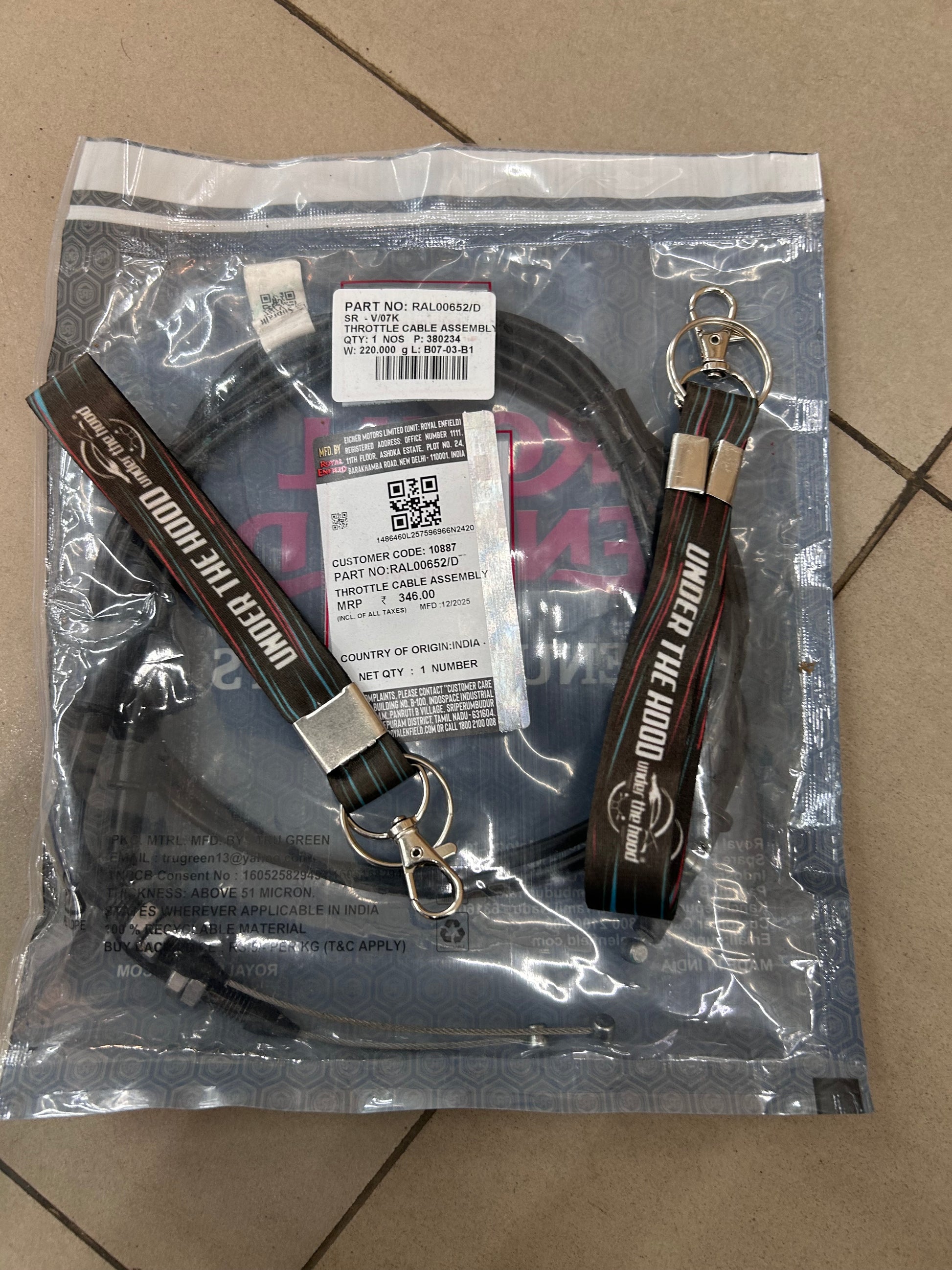 Genuine Royal Enfield Accelerator Cable (Part No. 571227/A), specifically designed for the Interceptor 650 and Continental GT 650 BS6 models. This is an OE-spec replacement cable ensuring smooth throttle response and reliable performance over long distances. Built to match factory specifications, this cable provides the correct length and tension for precise control.