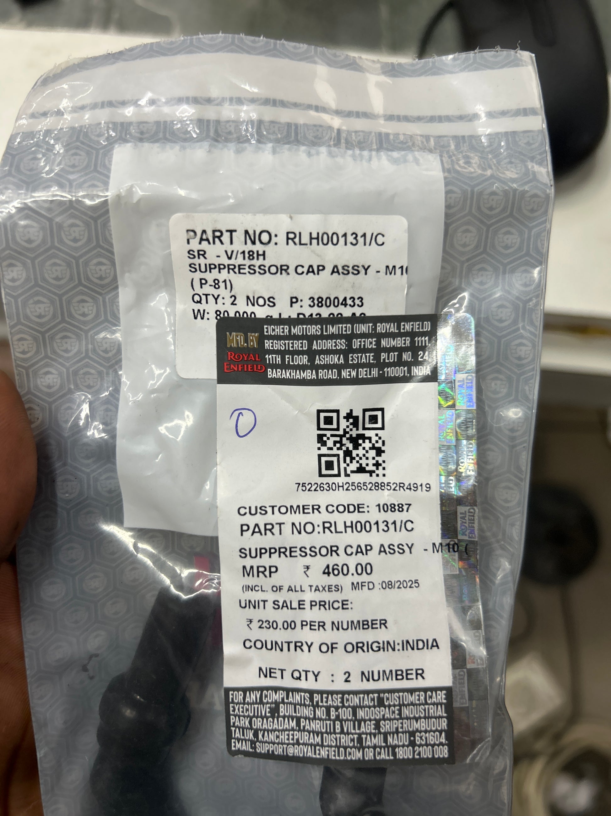 Ensure consistent spark and engine performance with the Royal Enfield RLH00131/B Suppressor Cap Assembly (M10 P‑81)—a genuine OEM electrical component used in Royal Enfield’s 650cc Twin motorcycles. This suppressor cap is designed to insulate and protect the spark plug connection while reducing electromagnetic interference, delivering reliable ignition even under demanding conditions.