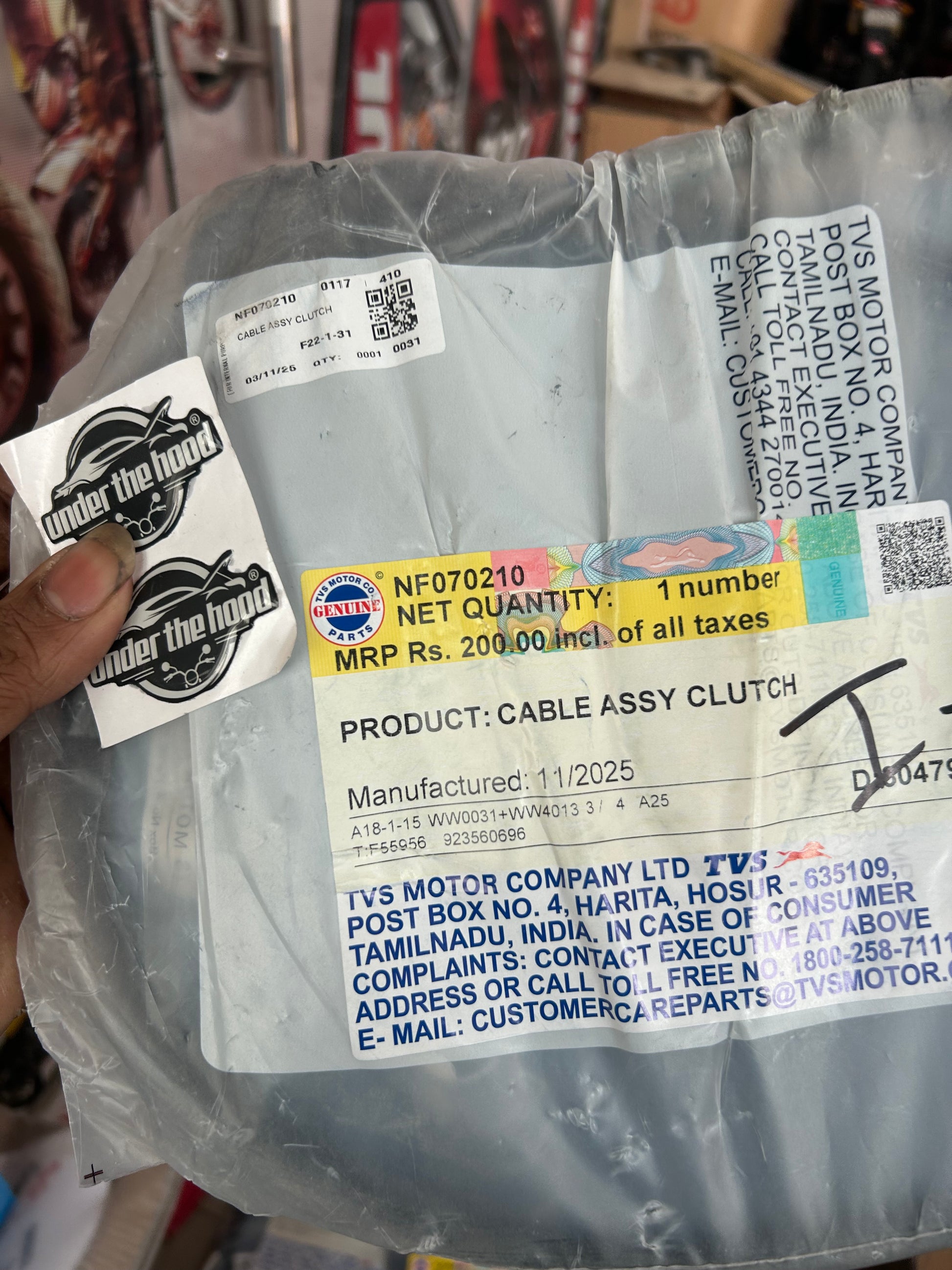 NF070210 is listed as “CABLE ASSY CLUTCH” for the Ronin 225 platform in official TVS parts-store listings and reputable parts portals. Using a genuine cable helps ensure the correct end fittings, adjuster threads, and overall geometry so the cable routes and operates as intended—without kinks, binding, or improper free-play range that can happen with generic/local copies.