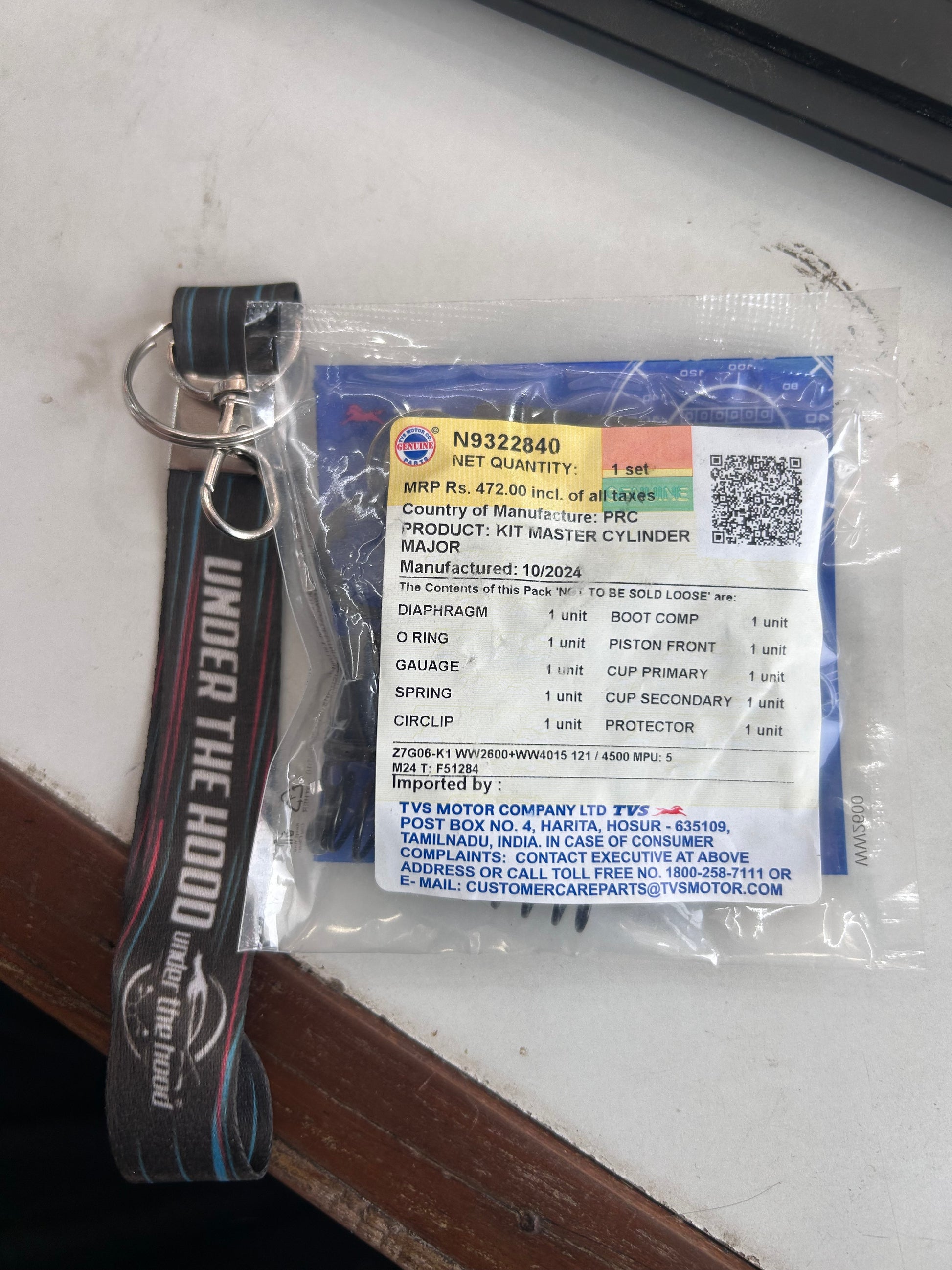 The TVS N9322840 Kit Master Cylinder (Major) is the genuine OEM front brake master cylinder repair kit used across the Apache RTR 160, Apache RTR 160 4V, Apache RTR 180, Apache RTR 200 4V and TVS Neo XR / X3i (front disc variants). In multiple official TVS parts catalogues, N9322840 appears as the “KIT MASTER CYLINDER (MAJOR)” with contents like piston, S-cup, P-cup, spring, boot, snap ring, diaphragm, protector and holder for the front master cylinder.